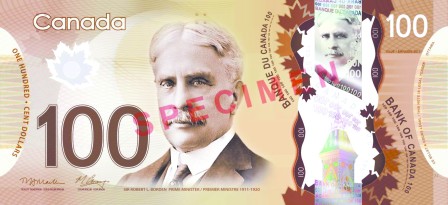 首先推出的百元鈔票上有前總理波頓(Robert Borden)的2個(gè)肖像,1個(gè)大的肖像在正面,另1個(gè)稍小的金屬色澤肖像則兩面都可看到。
