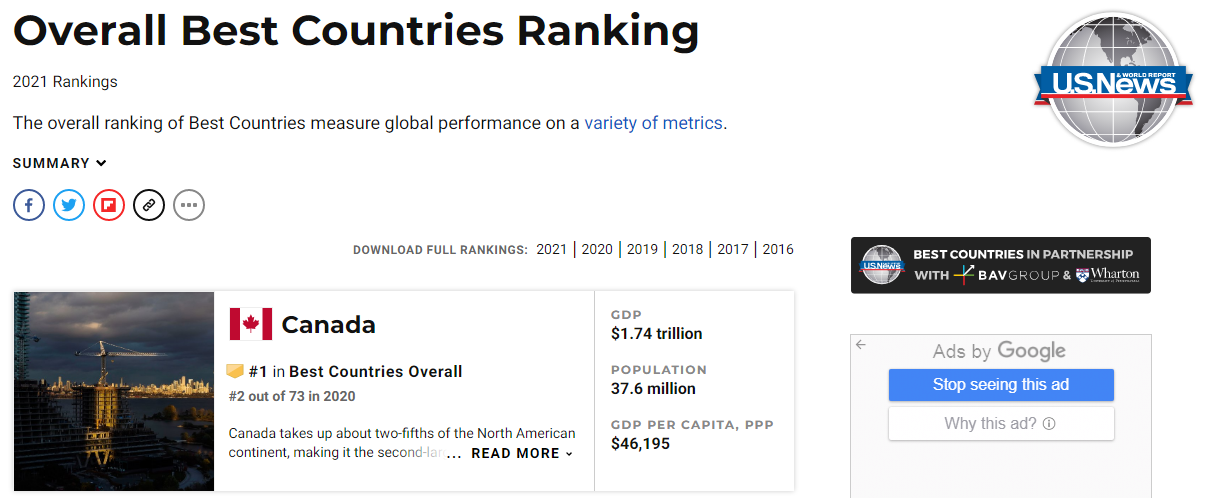 一、2021年4月13日,美國新聞與世界報導(U.S. News & World Report)公布了2021年度最佳國家(Best Countries)排名,加拿大排名全球第一.