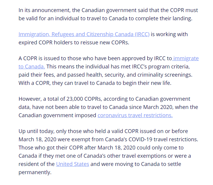 然而,由于疫情的影響,加拿大移民部發(fā)出去的有超過(guò)23000份COPR移民紙的持有者無(wú)法登陸加拿大。這個(gè)數(shù)字是加拿大政府統(tǒng)計(jì)的,由2020年3月份加拿大疫情進(jìn)入大流行,限制所有國(guó)際旅行的邊境政策實(shí)施開(kāi)始。