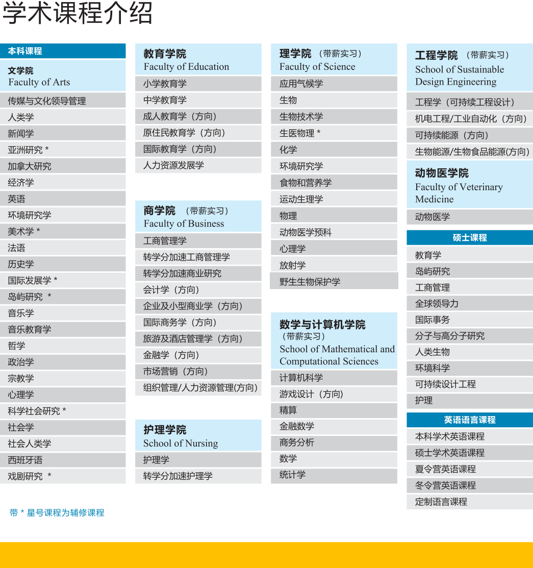 ?加拿大護(hù)理專業(yè)學(xué)士學(xué)位授予大學(xué)之一;加拿大5大獸醫(yī)學(xué)院之一,唯一獸醫(yī)醫(yī)藥博士點(diǎn);一流的教學(xué)團(tuán)隊(duì),卓越的教育品質(zhì);小班教學(xué)、注重交互,教師和學(xué)生比例在加拿大為最佳大學(xué)之一。