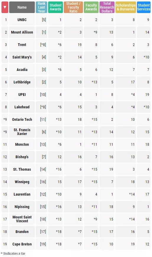 UNBC北英屬哥倫比亞大學由去年的第5名直接升至第1名,位于安省的Trent University川特大學同樣進步明顯,由去年的第8提升至第3。