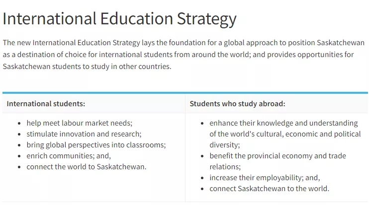 薩省的這項(xiàng)戰(zhàn)略包括一些與全球參與、能力建設(shè)和領(lǐng)導(dǎo)力方面有關(guān)的舉措,希望能增強(qiáng)該省國(guó)際學(xué)生市場(chǎng)的吸引力。