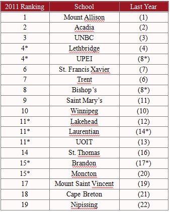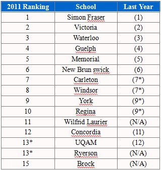 2011年加拿大大學(xué)最新排名: